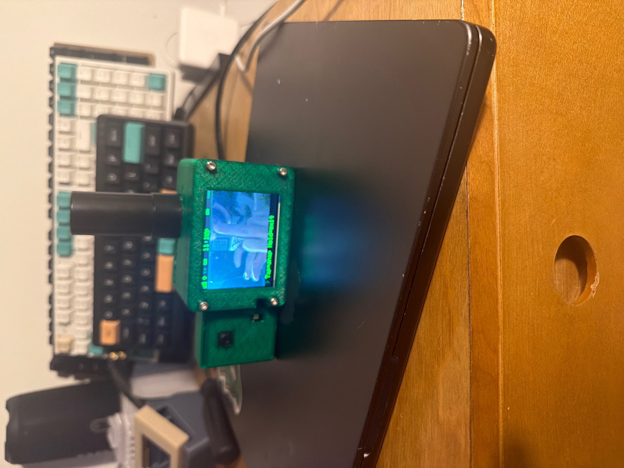 Triple-tap the button and Raspy enters camera mode. Live MJPEG stream from a separate ESP32-CAM shows up on the display. Tap to take a snapshot. Hold to exit back to voice mode.