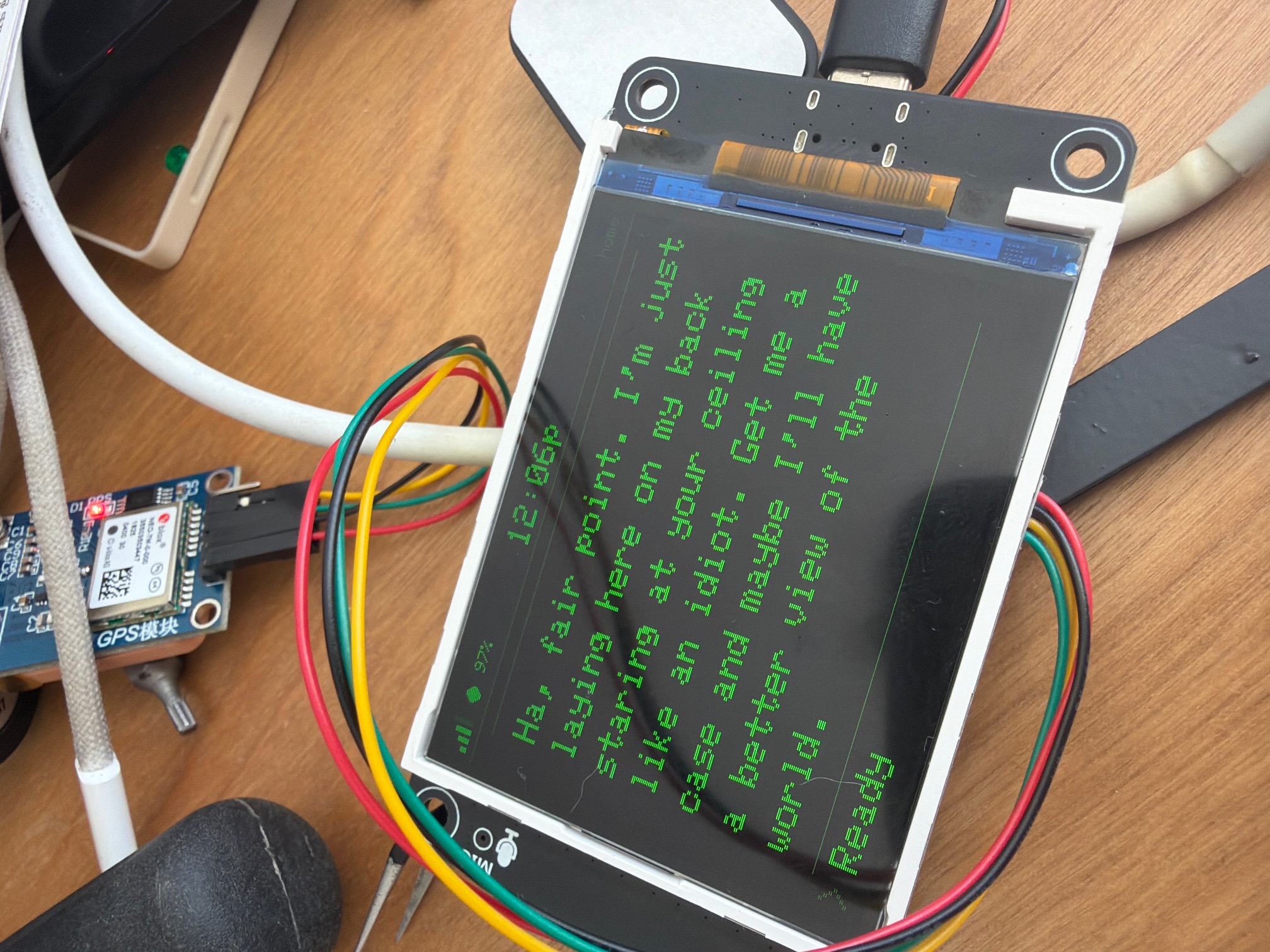 The ESP32 firmware is about 1500 lines of C++. The server is maybe 600 lines of Python. Not a huge codebase, but a lot of moving parts: WebSockets, HTTP, I2S audio, TFT display, GPS parsing, WiFi management.